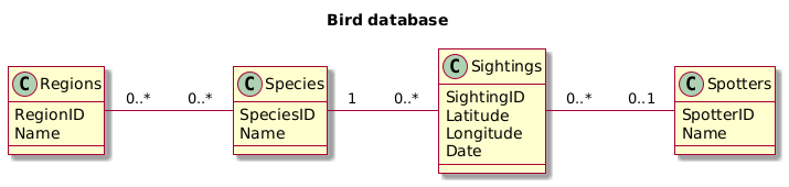 Implement the database as pictured above. Note that the many-to-many relationship between Species and Regions will require a junction table. Write the following in SQL (invent data as necessary).